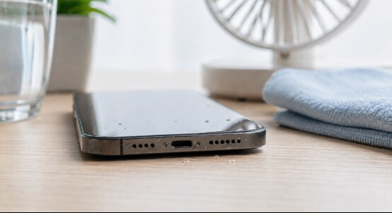 Lege dein Handy an einen trockenen, gut belüfteten Ort. Achte darauf, dass der Ladeanschluss nach unten oder zur Seite zeigt, damit die Feuchtigkeit von selbst ablaufen kann.